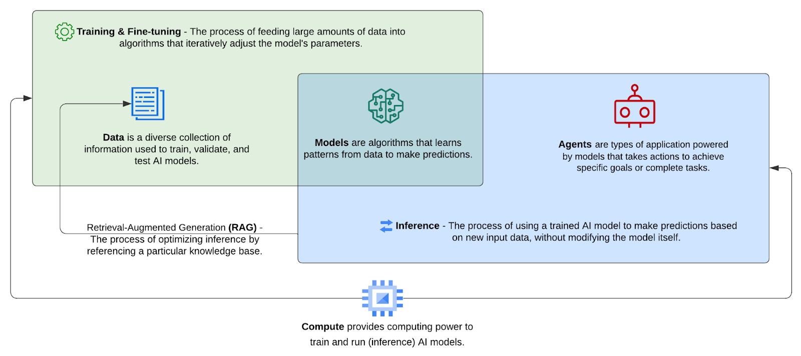The AI space can be effectively represented using a framework of four key components and two primary workflows. This framework consists of components: data, models, agents, and compute, along with the workflows of training/fine-tuning and inferencing.