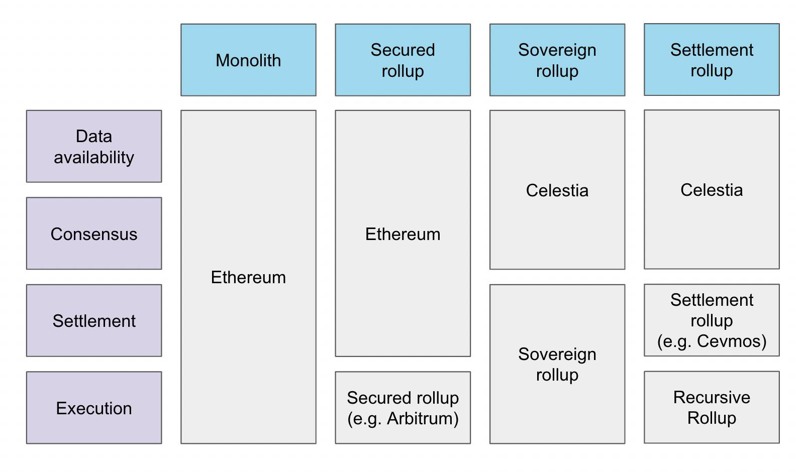 Modular blockchain stack comparison showing different approaches to data availability and settlement (Source: Delphi Digital)