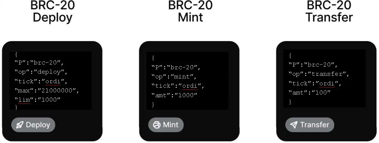 The three phases for the creation of a BRC-20 token: Deploy, Mint, and Transfer