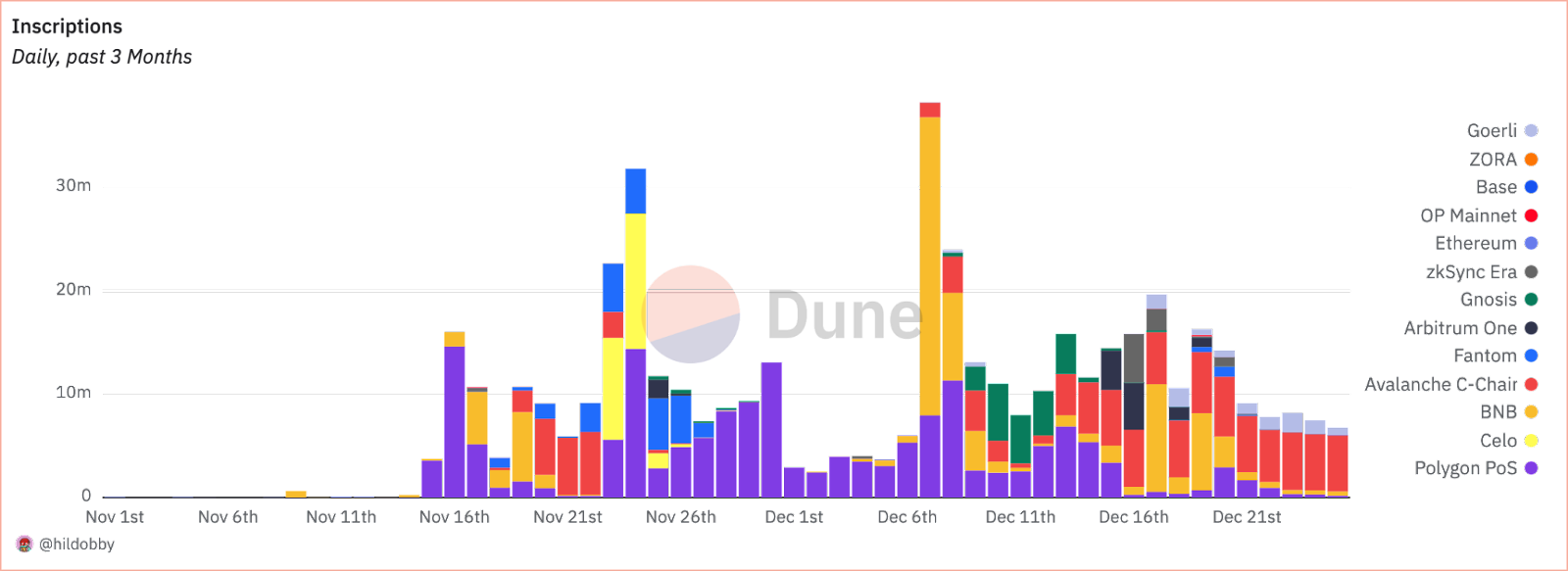 EVM inscriptions activity from various L1s and L2s demonstrating cross-chain adoption