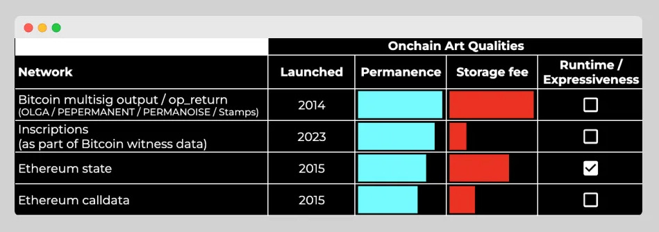 The Ordinals protocol, created by Casey Rodarmor (@rodarmor), introduced a method for storing data efficiently on Bitcoin. Users can now "store any kind of data as code with a cheaper onchain storage price than even Ethereum calldata."