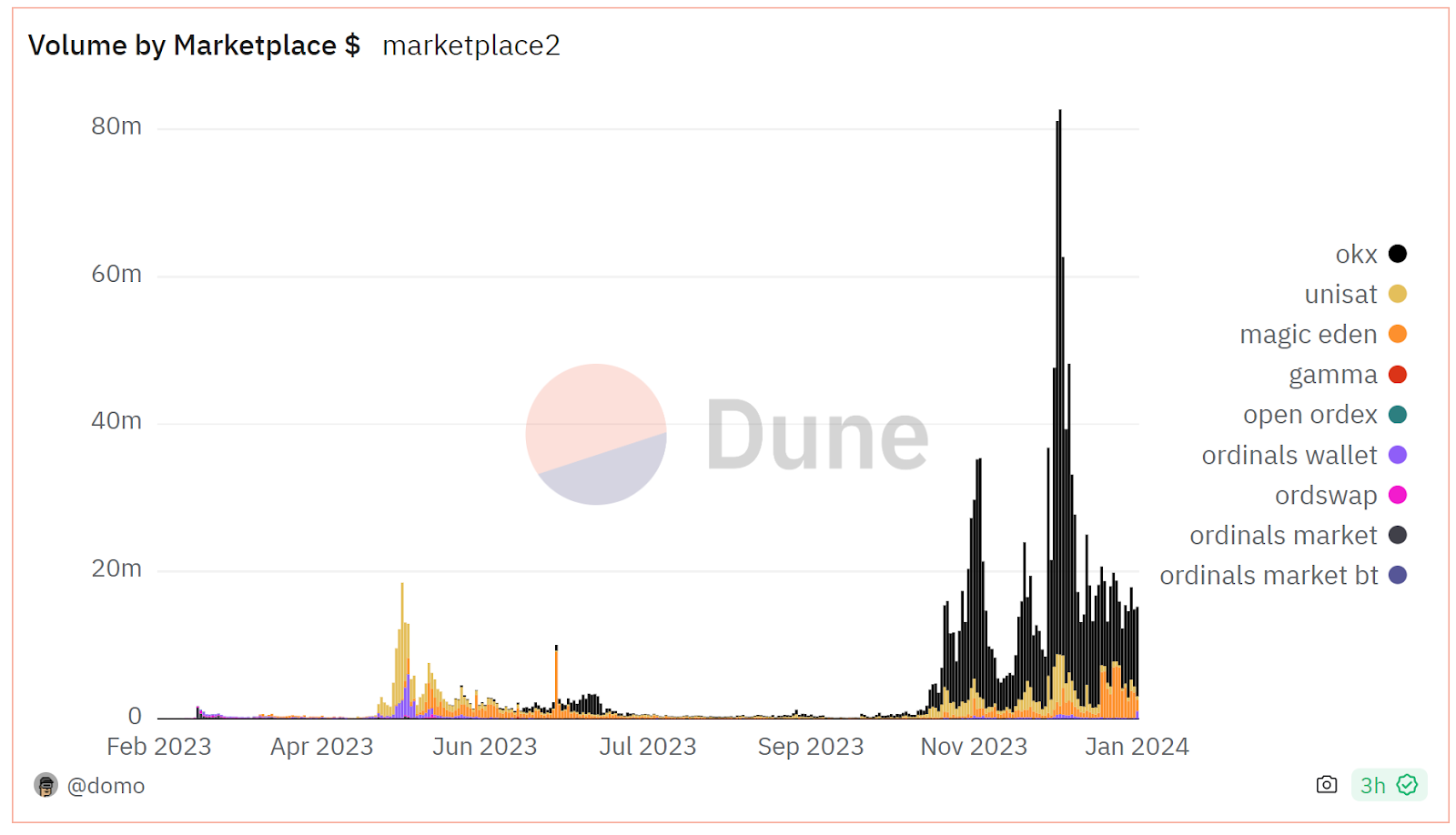 OKX Wallet and Unisat dominate trading volume; Magic Eden added Bitcoin NFT support, bringing established marketplace infrastructure to the ecosystem.