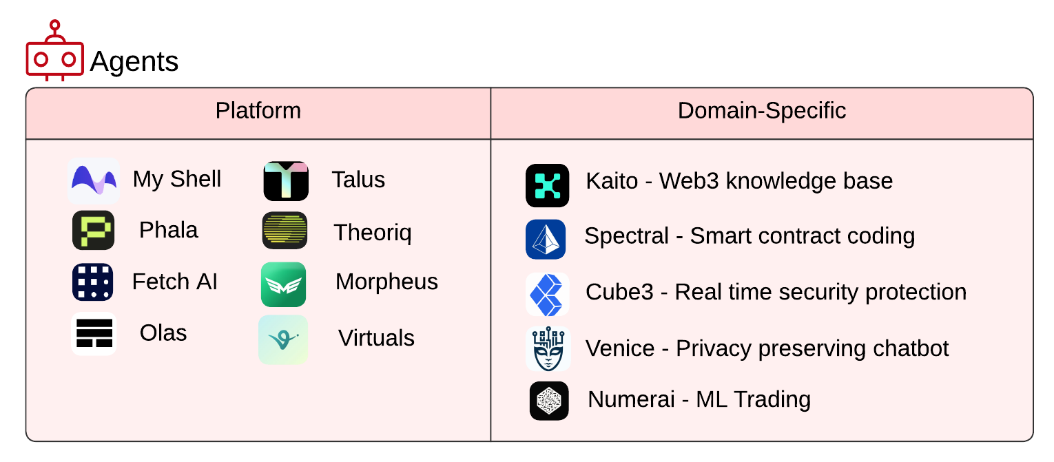 AI agent projects categorized by application type: AI-powered platforms and blockchain-data specialists