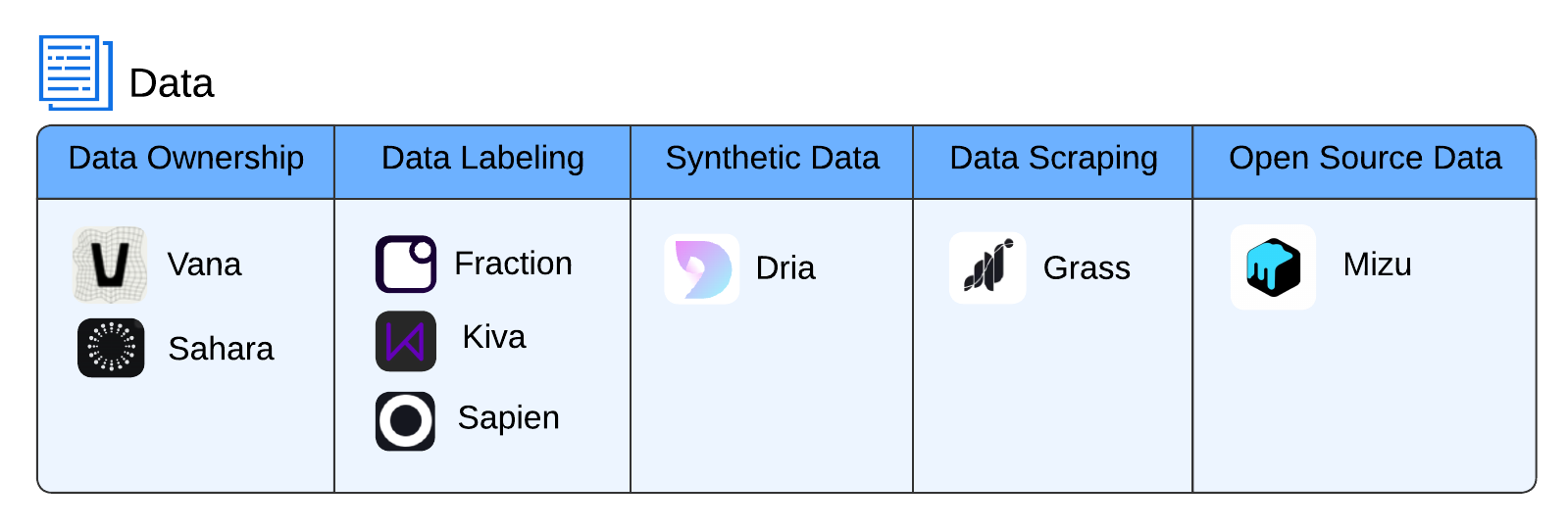 Overview of data-focused projects in the AI x Crypto ecosystem, categorized by their primary focus areas