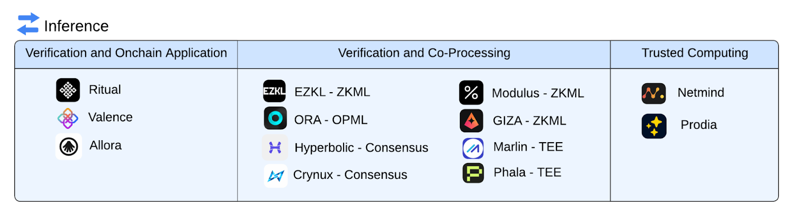 - Verification and Onchain Application: These projects verify inference results and provide tools to build on-chain applications using these results.