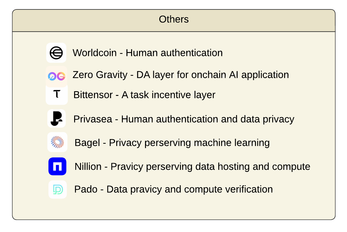 Beyond the main categories, several innovative projects are employing diverse approaches to advance blockchain AI. These initiatives primarily focus on enhancing data privacy, ensuring computing privacy, optimizing processing techniques, and/or improving human authentication methods. Each project addresses critical challenges in the blockchain AI ecosystem, contributing to its overall progression and security.